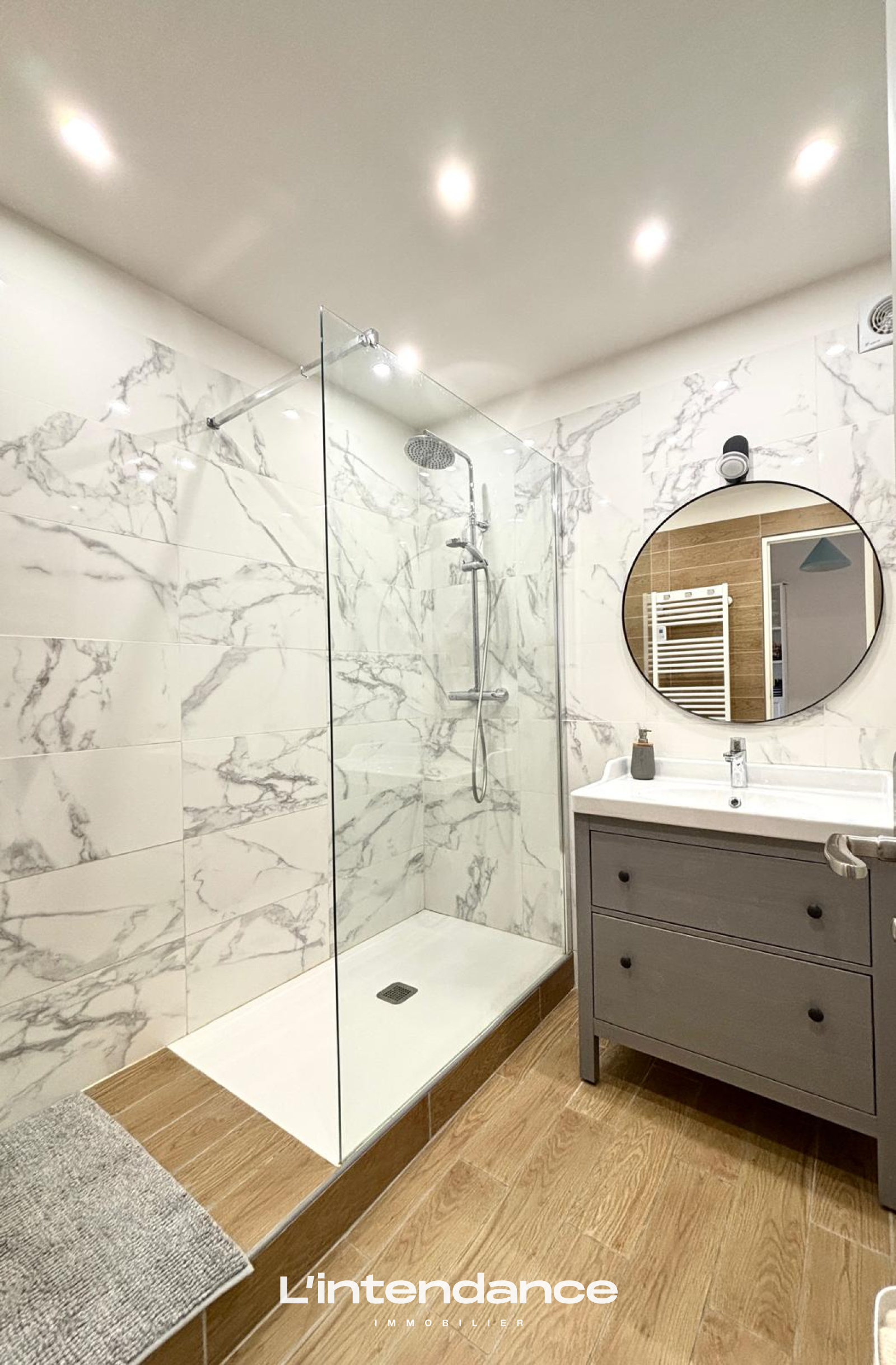 À l’étage, l’espace nuit se compose de 5 chambres, dont une avec terrasse privative, de nombreux rangements, ainsi que d’une salle de bains avec double vasque et d’un WC indépendant.